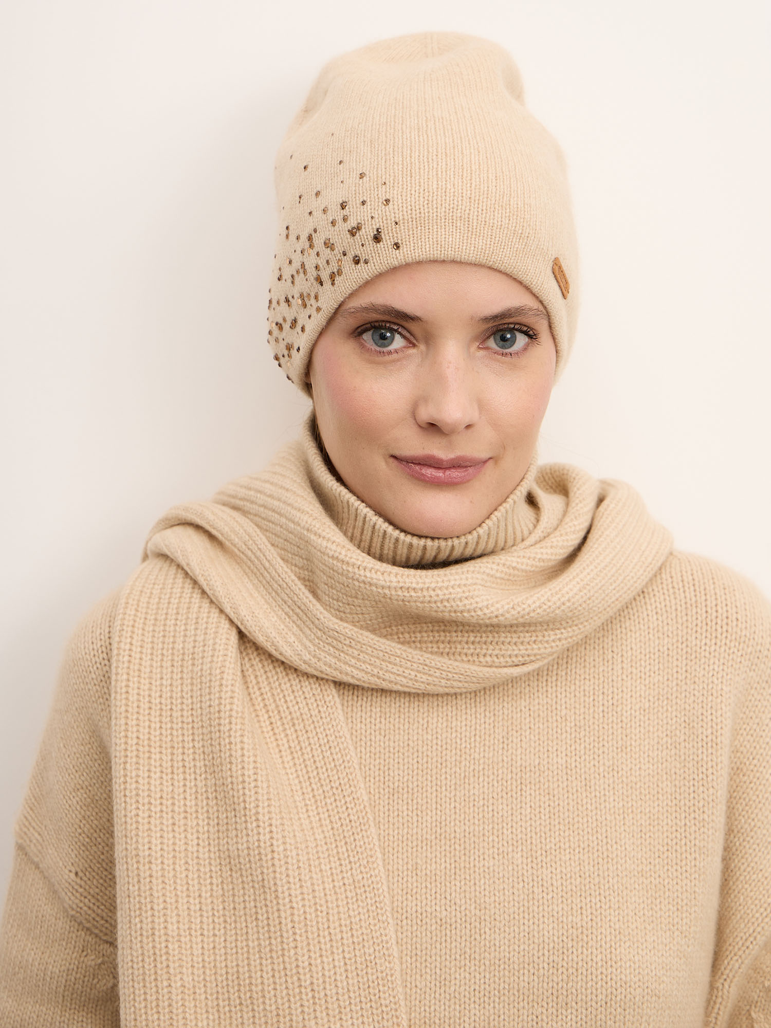 Шапка выполнена из мягкого кашемирового трикотажа, который приятно прилегает к коже, не вызывает раздражения и сохраняет тепло даже в ветреную погоду. Украшение из мелких страз у нижнего края создаёт лёгкий блеск, который красиво переливается на свету. Эластичная структура изделия обеспечивает комфортную посадку и идеальную форму.