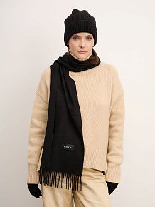 Шапка выполнена из мягкого кашемирового трикотажа с плотной резинкой, которая обеспечивает идеальную посадку и комфорт при носке. Чёрный оттенок придаёт образу выразительность и сдержанную элегантность. Маленький металлический элемент на боку добавляет изысканный акцент, не нарушая чистоты линии и формы.