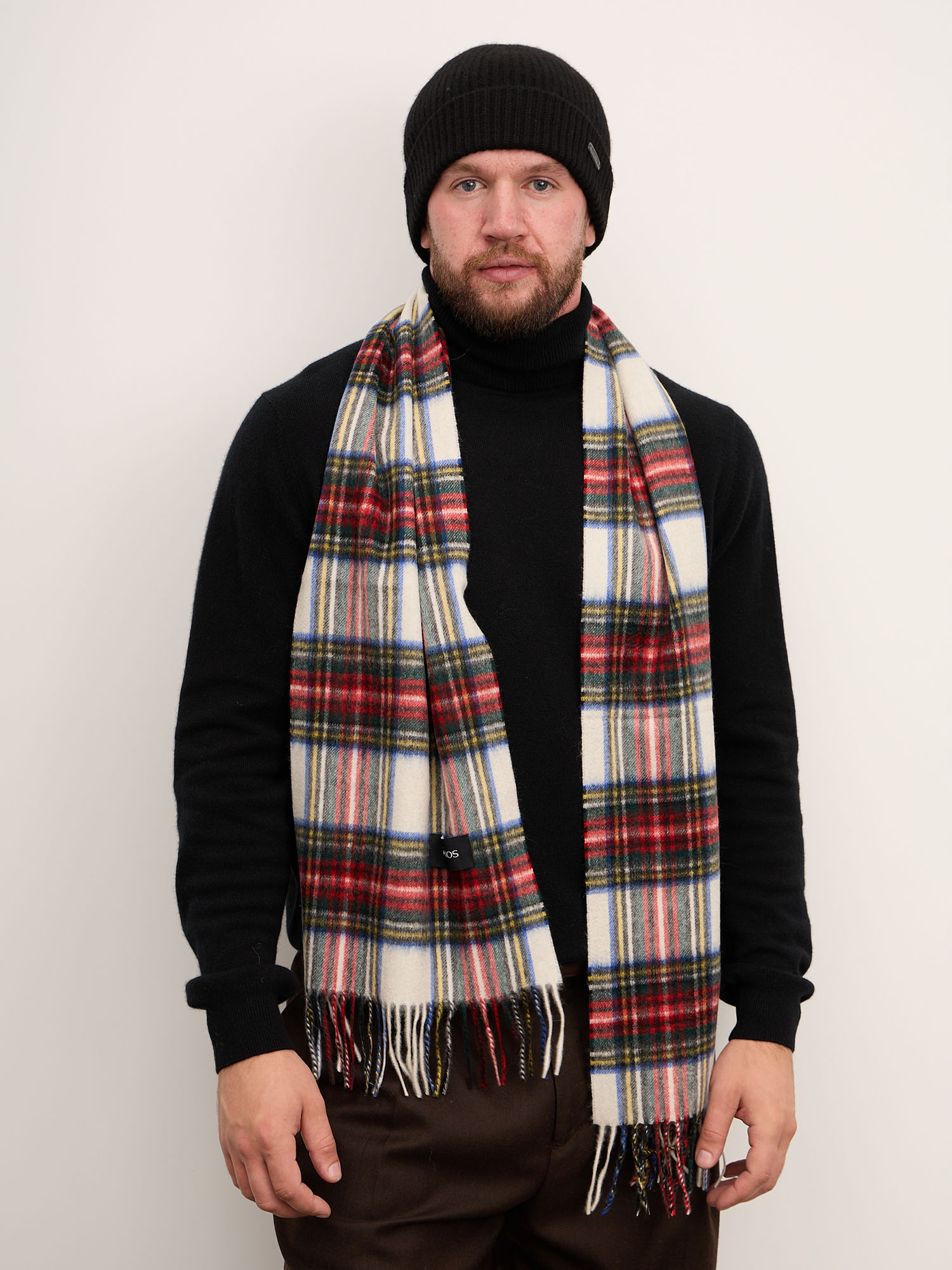 Классическая прямоугольная форма с аккуратной бахромой по краям. Клетчатый узор в традиционном стиле придаёт шарфу выразительность и делает его стильным дополнением гардероба.