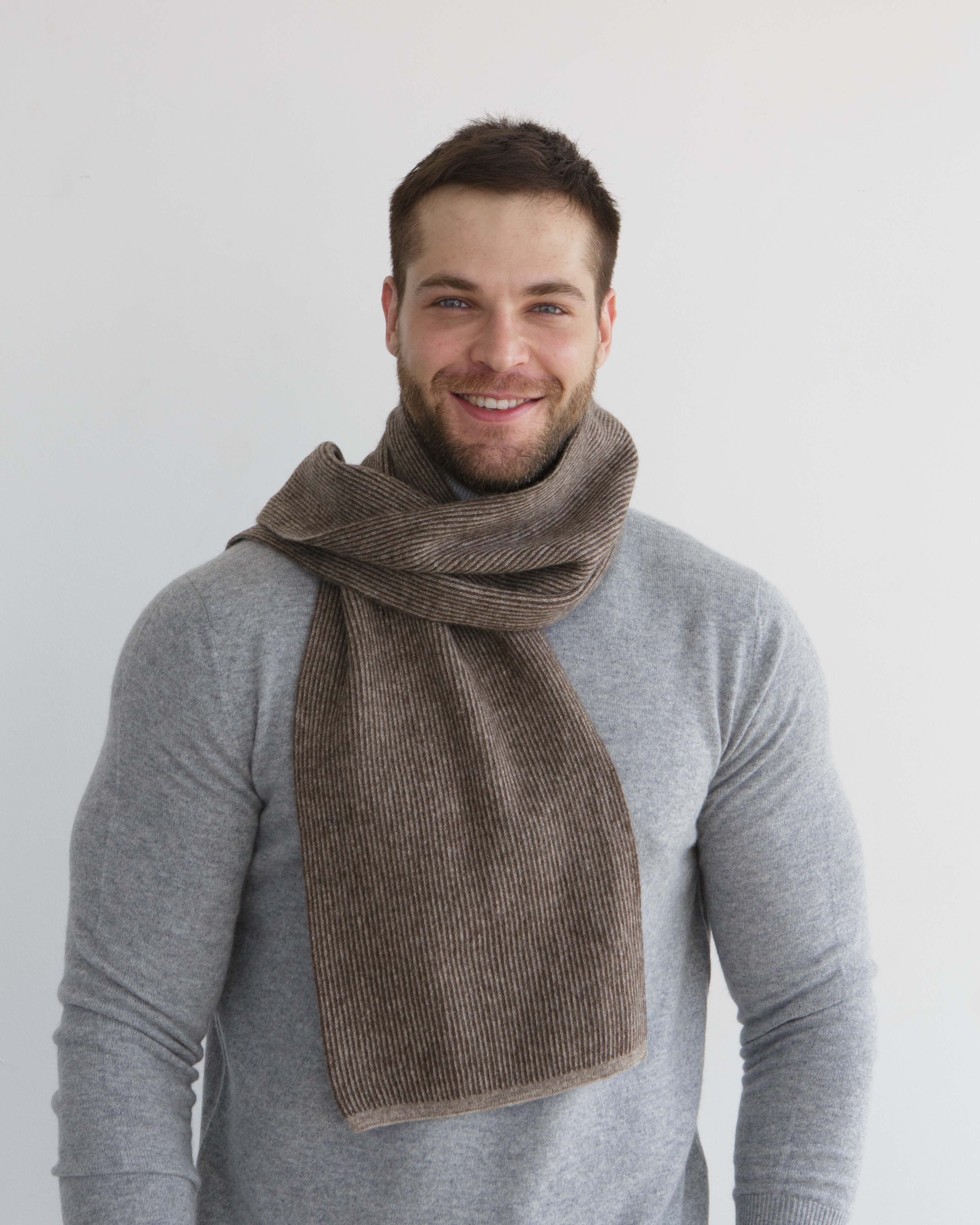Приобрели шарф для мужчины, чтобы носить его с курткой без воротника. Шарф теплый плотно связан, мягкий, коричневый цвет и серые полоски. |