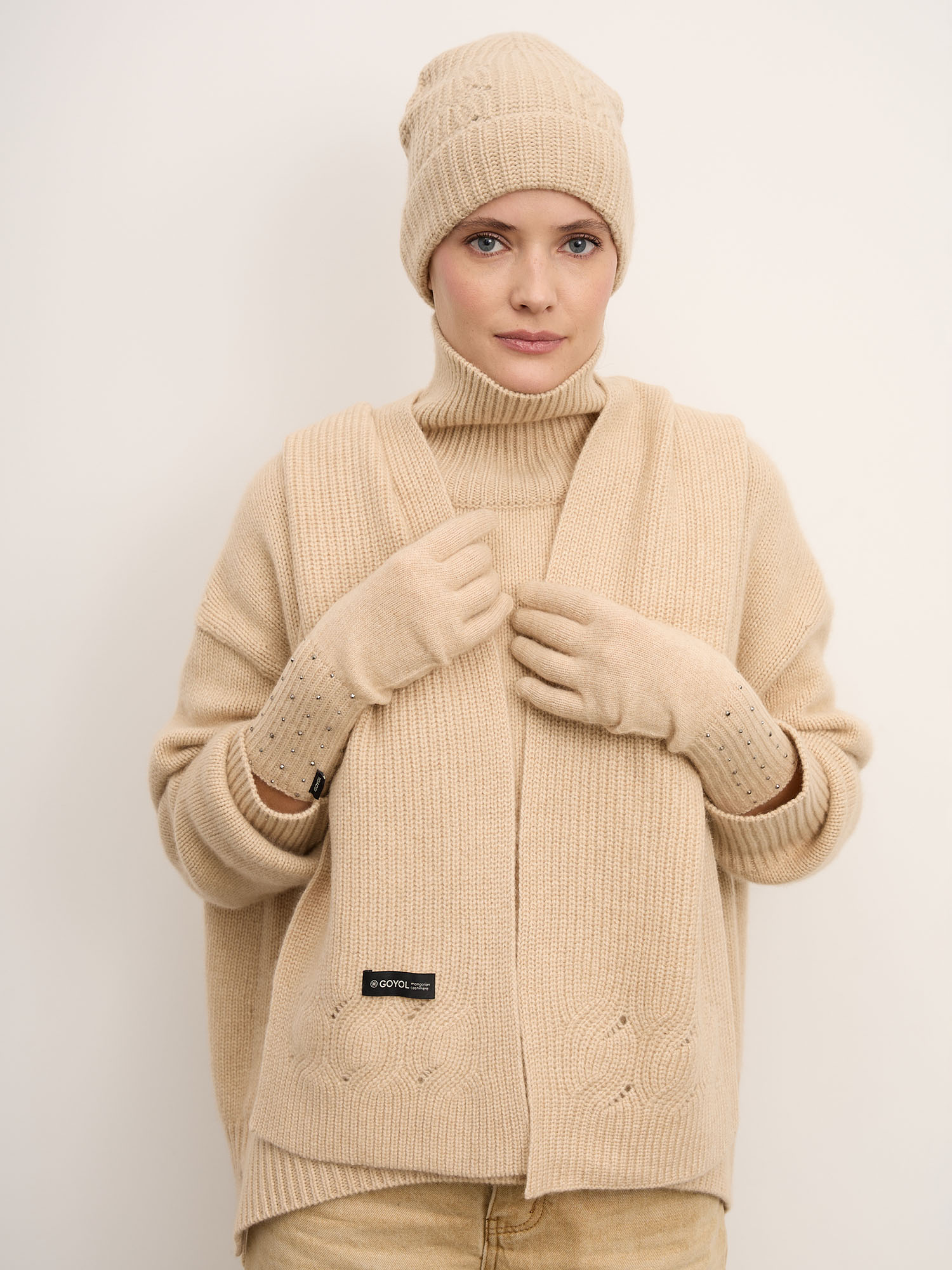 Бежевый оттенок подчеркивает мягкость и универсальность изделия, а блеск страз добавляет образу утончённости. Легко сочетается с любой верхней одеждой.