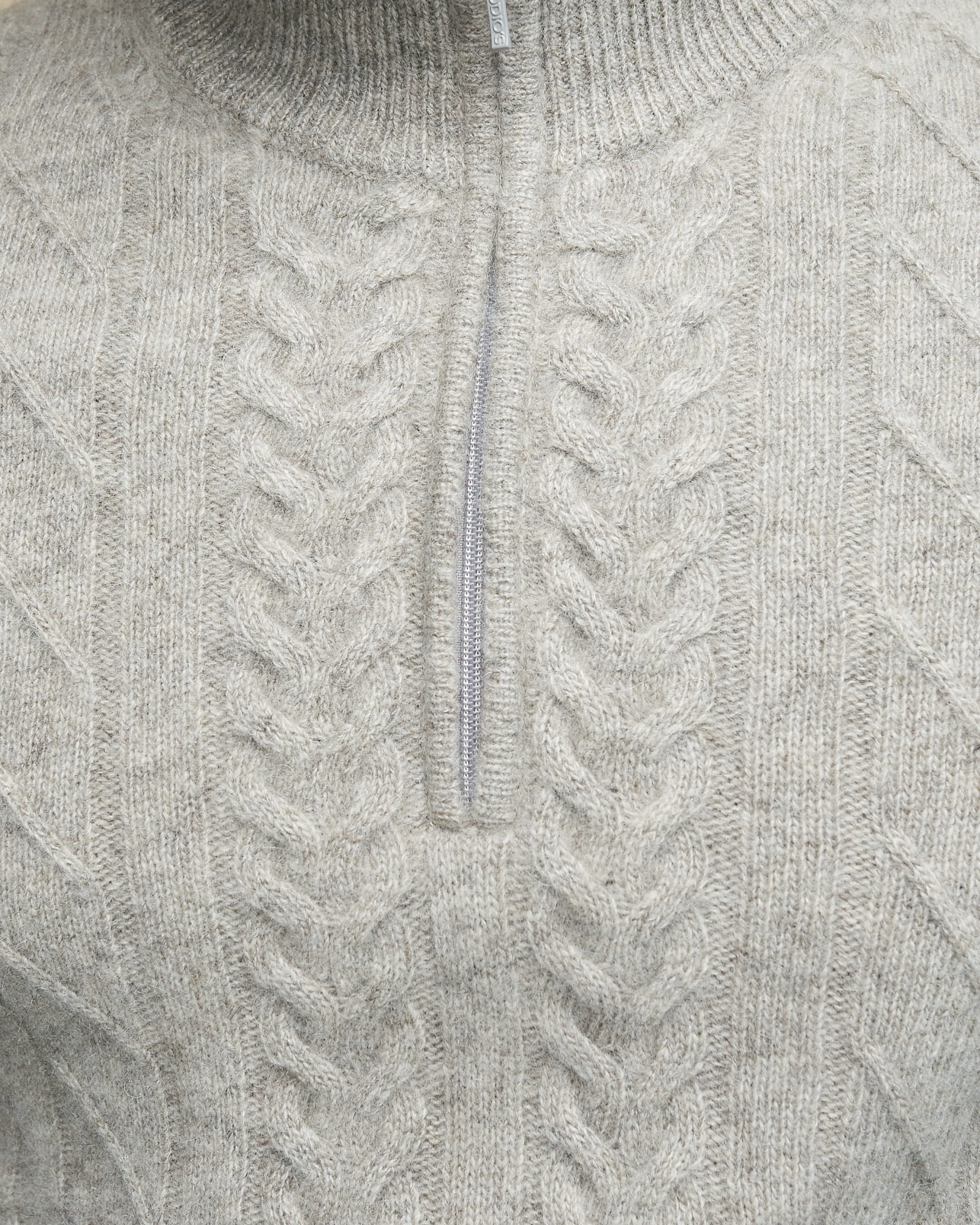 Молния у горловины для регулировки посадки, фактурная вязка, эластичные манжеты и нижняя резинка, сохраняющие форму изделия.