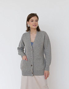 Застёжка на пуговицы по передней планке, два накладных кармана, аккуратная трикотажная отделка манжет и нижнего края изделия. Мягкая вязка подчёркивает фактуру натуральной шерсти.