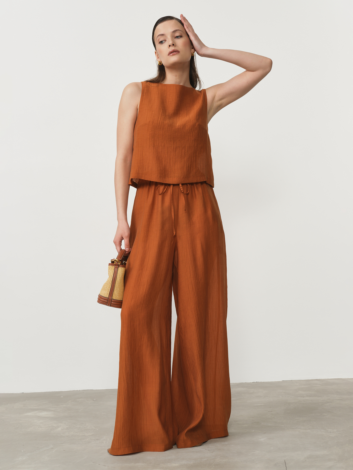 Брюки из лиоцелла терракотового оттенка — это гармония экологичности и современного стиля. Созданные из инновационного материала лиоцелл, полученного из древесной целлюлозы, они сочетают в себе преимущества натуральных тканей с передовыми технологиями производства. Терракотовый цвет с теплым рыже-коричневым подтоном напоминает оттенки заката, добавляя образу глубину и природную элегантность.