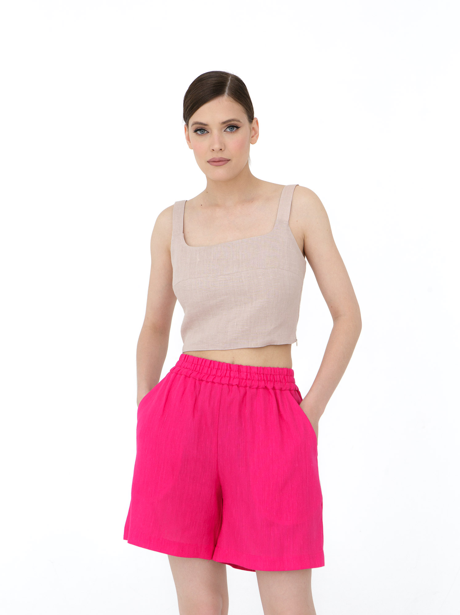 Топ отлично сочетается с юбками, шортами и брюками из льна или хлопка. Для повседневного образа — с сандалиями и легкими аксессуарами, для более элегантного — с жакетом и обувью на каблуке. Подходит для прогулок, отдыха и летних поездок.