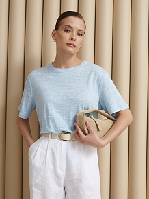 Футболка из конопли — идеальный выбор экостиля. Голубой оттенок живой, сочетается с любыми брюками. |