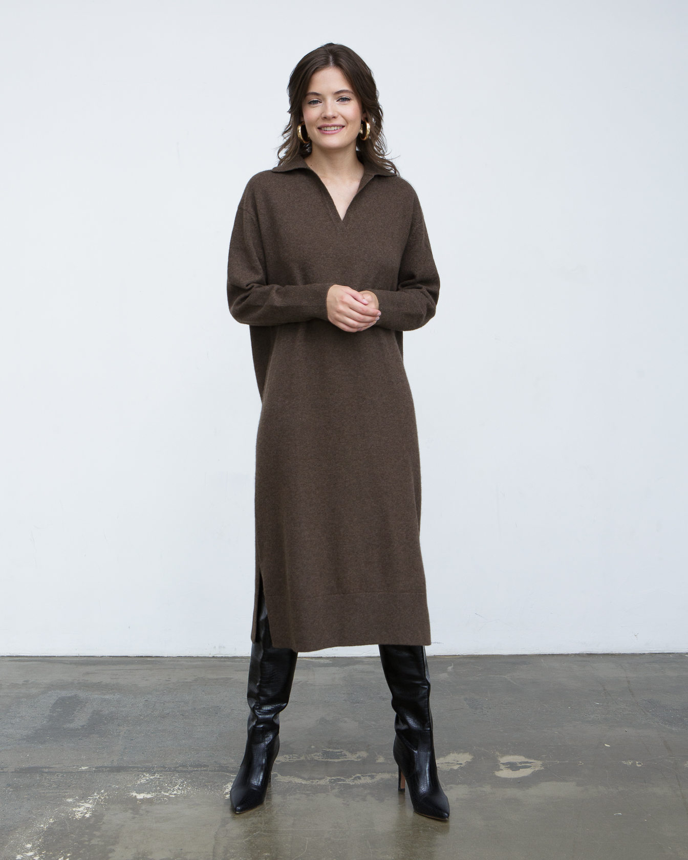 Прямой силуэт миди-длины с аккуратным воротником-поло и боковым разрезом для свободы движений. Лаконичный крой делает модель универсальной и вне времени.